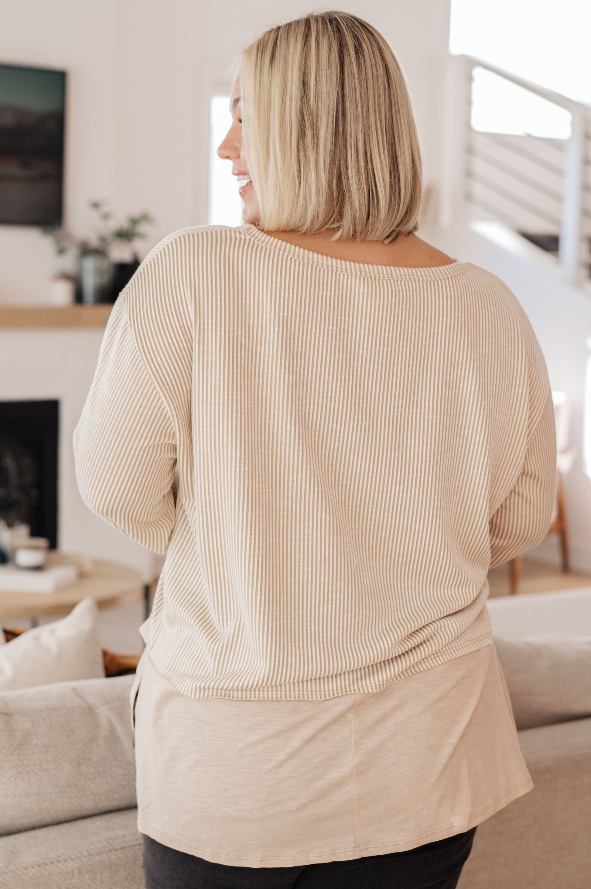 Stay comfortable and stylish with this Just Another Idea Long Sleeve Top. It has a ribbed knit body for a snug fit, and a jersey knit accent for added warmth. Raw edge details and thumb holes finish off this timeless top.
