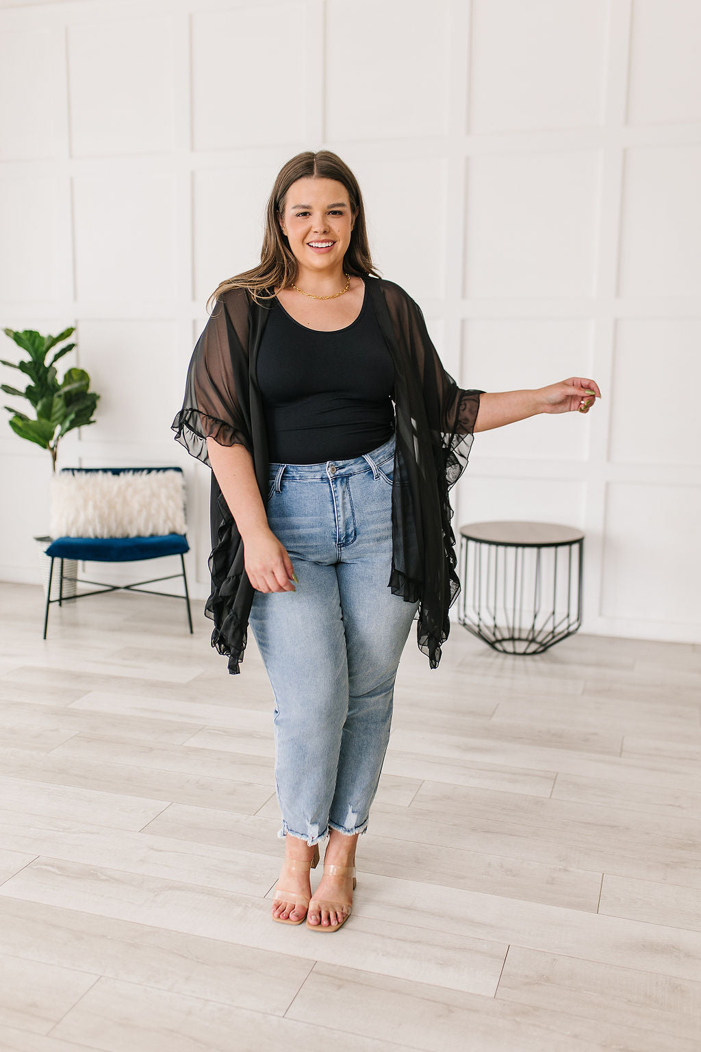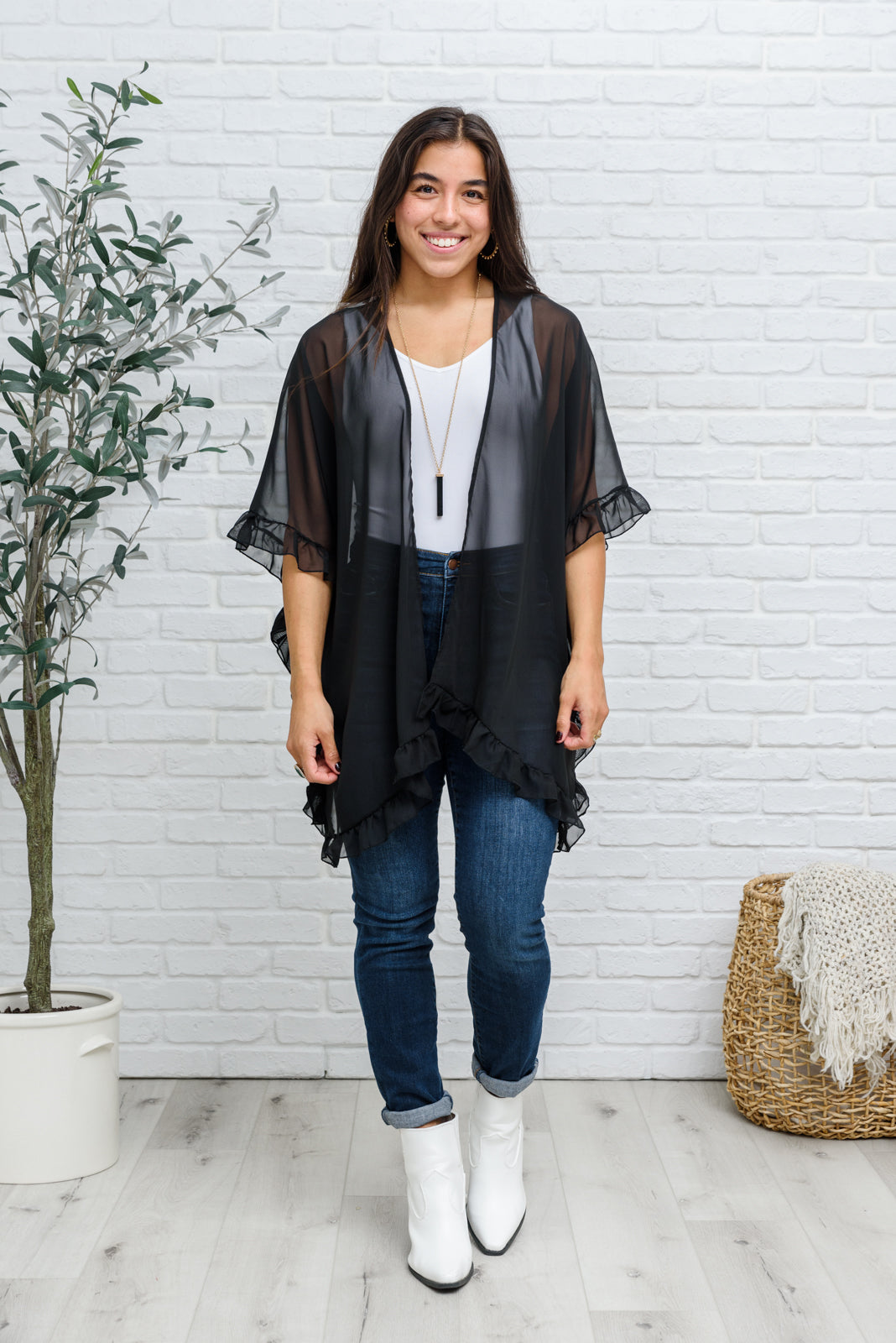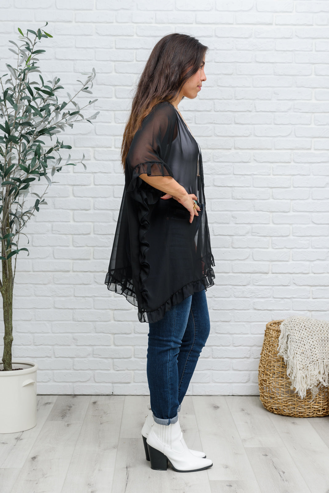 Give a chic upgrade to your look when you pair it with the Leave You Guessing Kimono! The details on this stunning piece will make you feel elegant and girly! We haven't stopped obsessing over the ruffle trim, drapey silhouette, elbow length kimono sleeves, and rounded hem. This looks amazing paired over a black mini dress and heels!