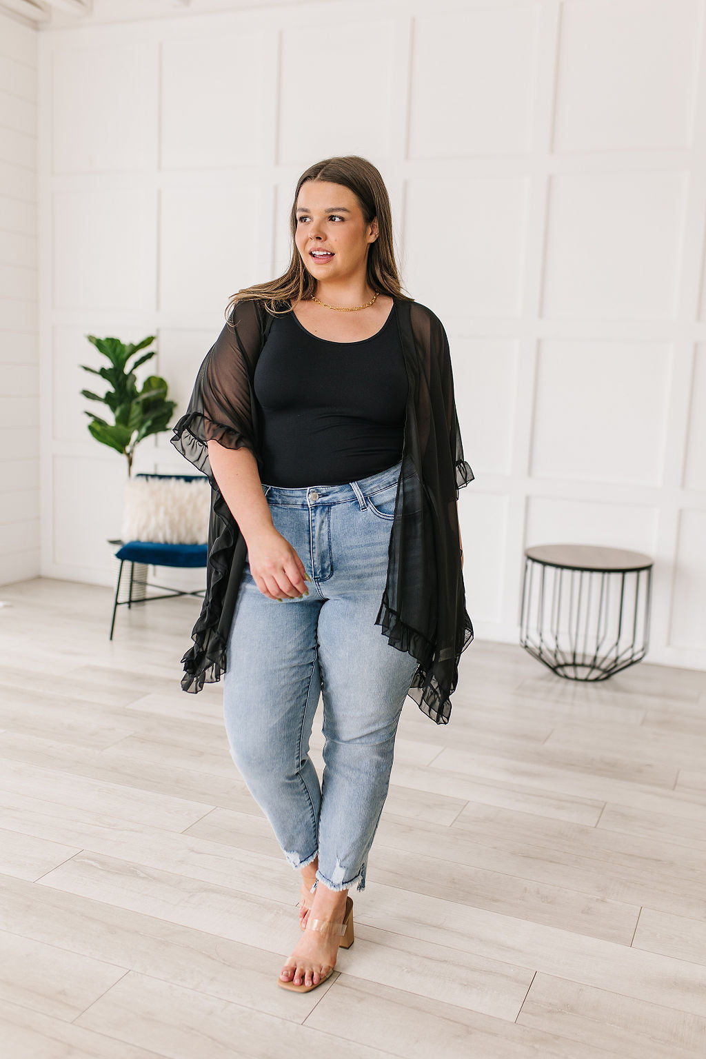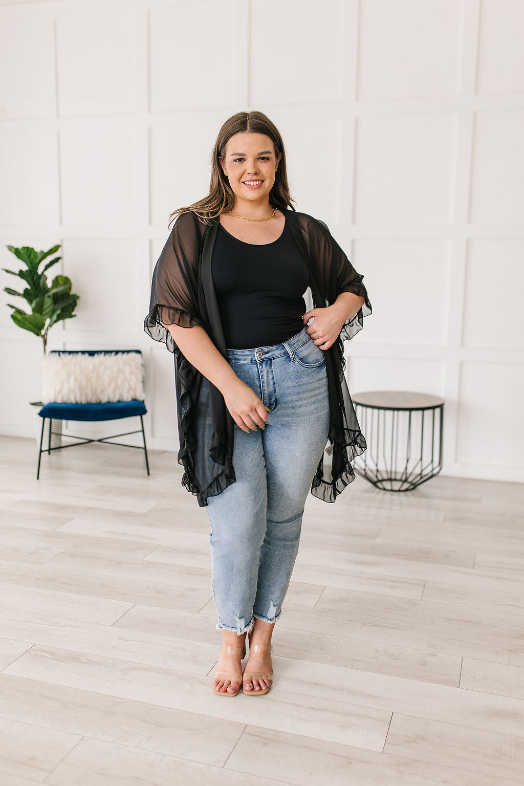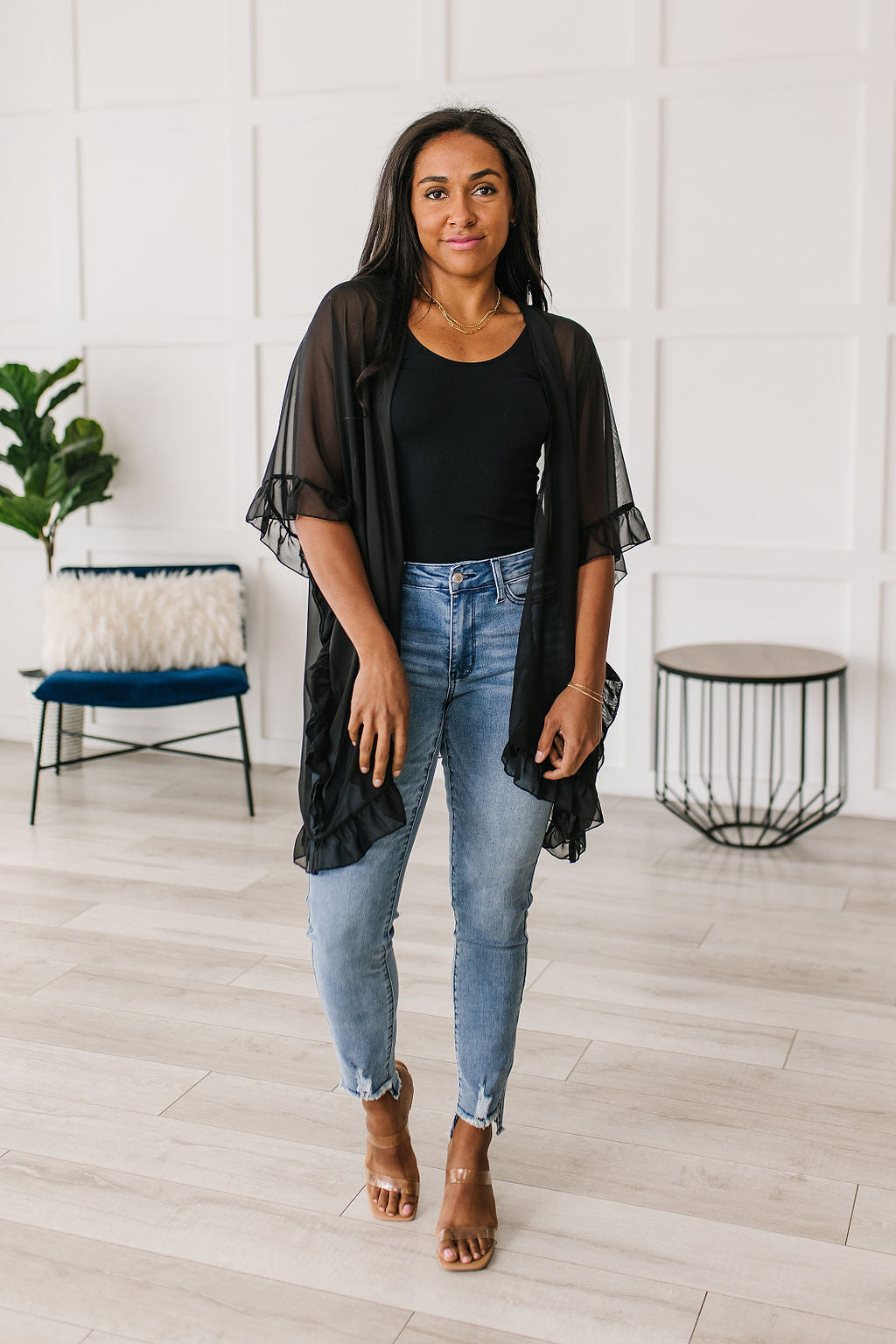 Give a chic upgrade to your look when you pair it with the Leave You Guessing Kimono! The details on this stunning piece will make you feel elegant and girly! We haven't stopped obsessing over the ruffle trim, drapey silhouette, elbow length kimono sleeves, and rounded hem. This looks amazing paired over a black mini dress and heels!